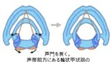 裏声を出す際、喉の中では主に輪状甲状筋(CT)という筋肉が働いています。この筋肉が活動することで声帯が前後に引き伸ばされ、薄く引き締まることで高音が生まれます。