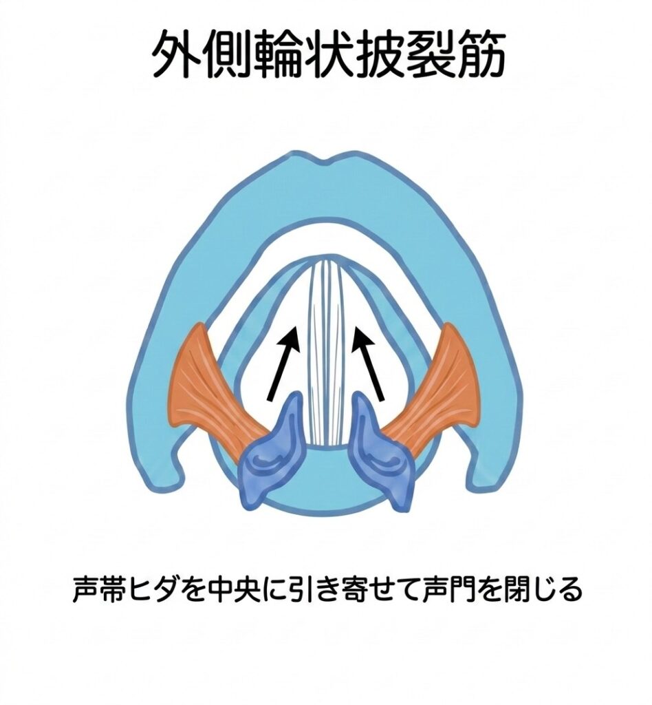 中高音を出す際、主役となるのは声帯を引き伸ばす輪状甲状筋(CT)です。しかし、CTがどれだけ頑張って声帯を引き伸ばしても、声帯が適切に閉じていなければ(閉鎖不全)、息漏れが生じて芯のない声になってしまいます。ここで重要になるのが「閉鎖筋」です。