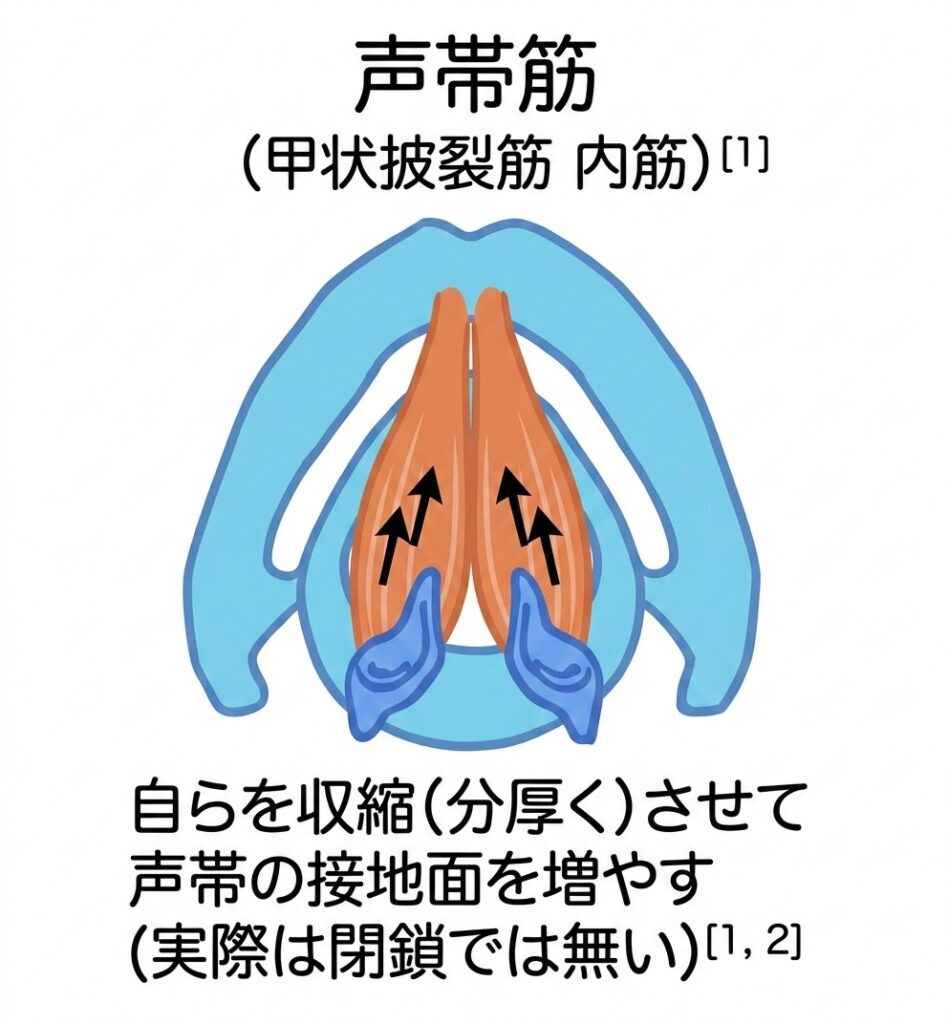 補足:声帯とは甲状披裂筋(声帯筋と仮声帯の総称です。)