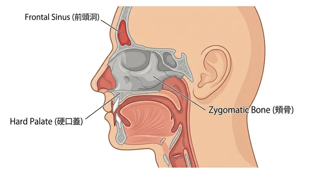 頬骨を伝わった振動は、最終的に眉間の奥にある空洞「前頭洞」を震わせます。 直接つながっていなくても、硬い骨という媒体を通ることで、音のエネルギーは一切ロスすることなく眉間まで届くのです。
